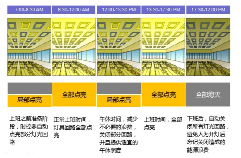6.节电模式;室内筒灯开至50%亮度,其他灯具全关,保证清洁人员有一个方便清洁打扫的光照度,同时又节约了能源;